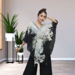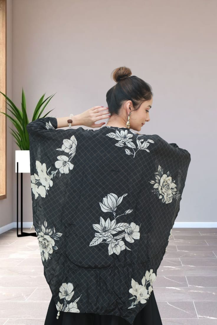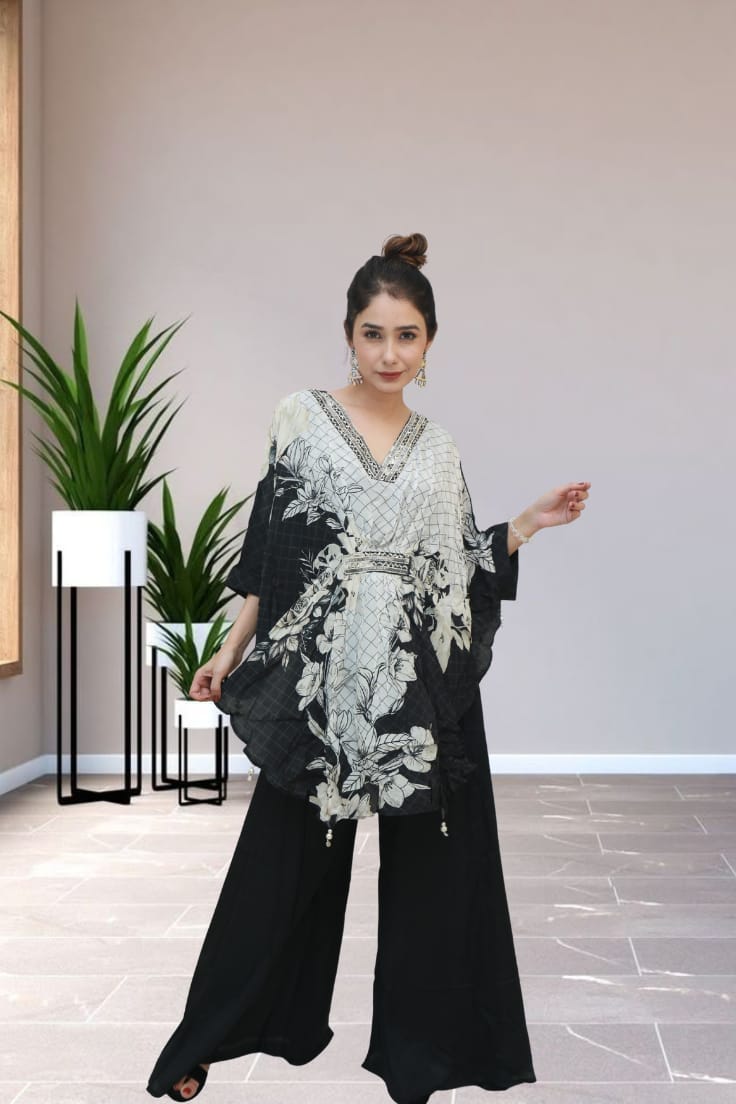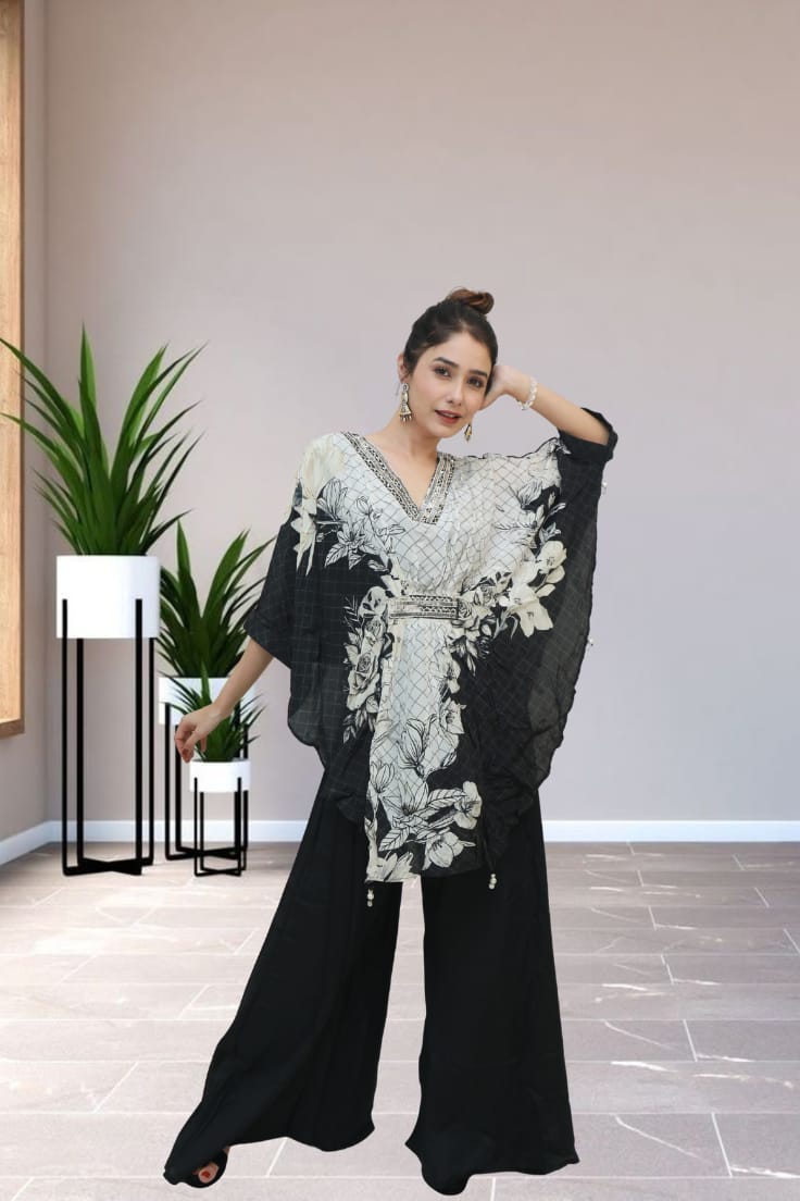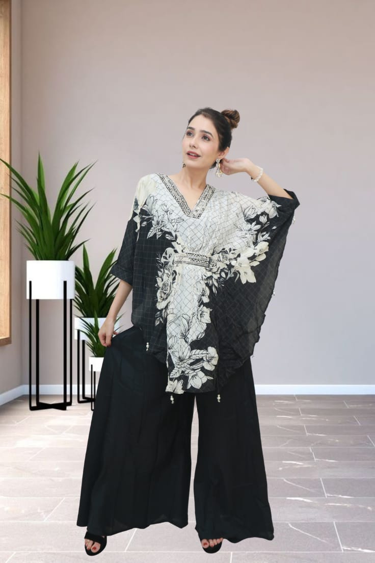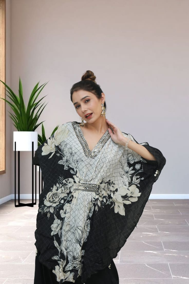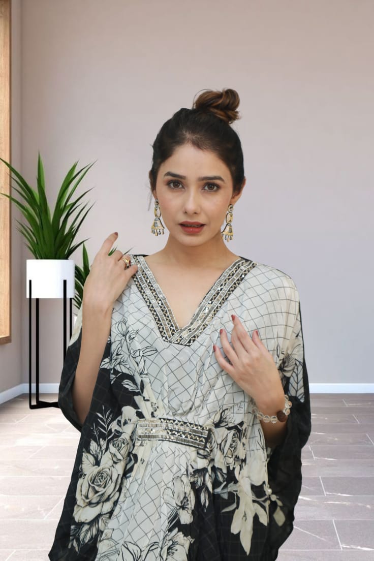 flowy kaftan-style top adorned with floral prints and delicate detailing. With hand work on the Neckline and on waist like a belt. Designed for effortless grace and all-day comfort.