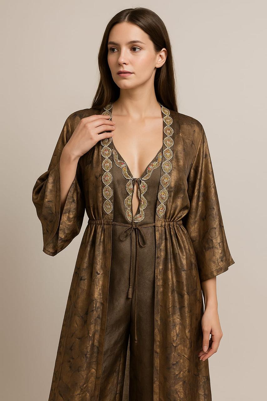 This mocha green gown is Crafted from luxuriously smooth imported material is perfect for newly wed, honeymoon, or vacation. this fluid drape two-piece gown is gonna give you Bollywood vibes, this sleeveless nightgown is detailed with designer diamond work lace in the front of the slip & it comes with designer soft shiny sheer jacket, which you wont see anywhere else.