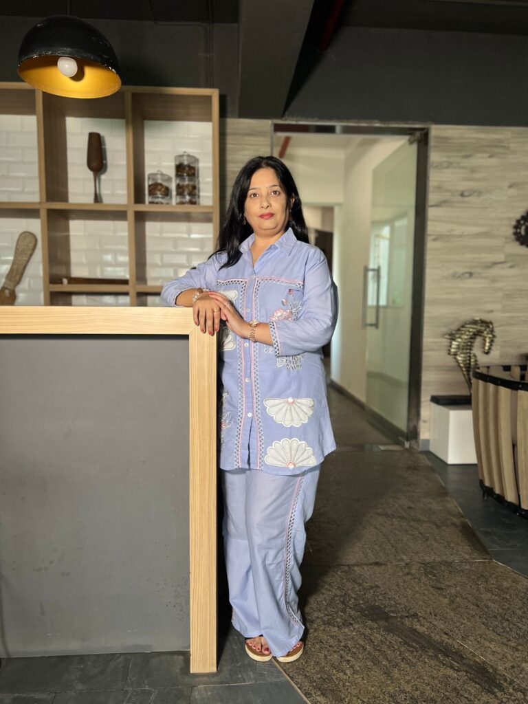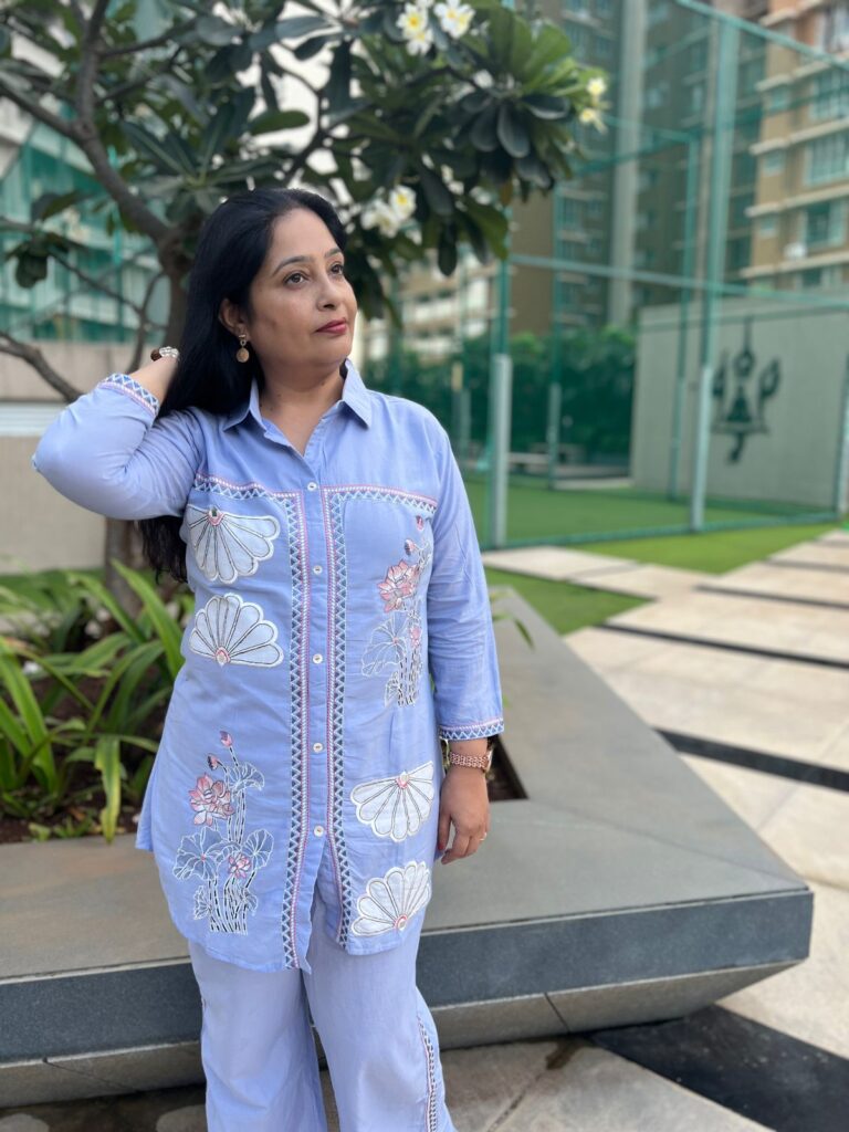 Step into effortless style and comfort with this elegant light blue cotton co-ord set. Crafted from shell-inspired embroidery