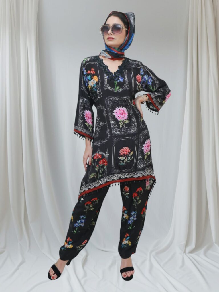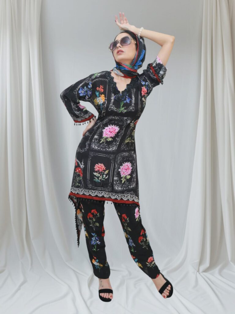 * Top: Designer-cut kurta with floral print