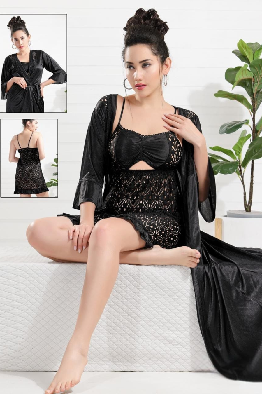 A stunningly soft inner see-through flower design net with satin design on the upper part with delicate long satin overcoat with detailed lace work.
