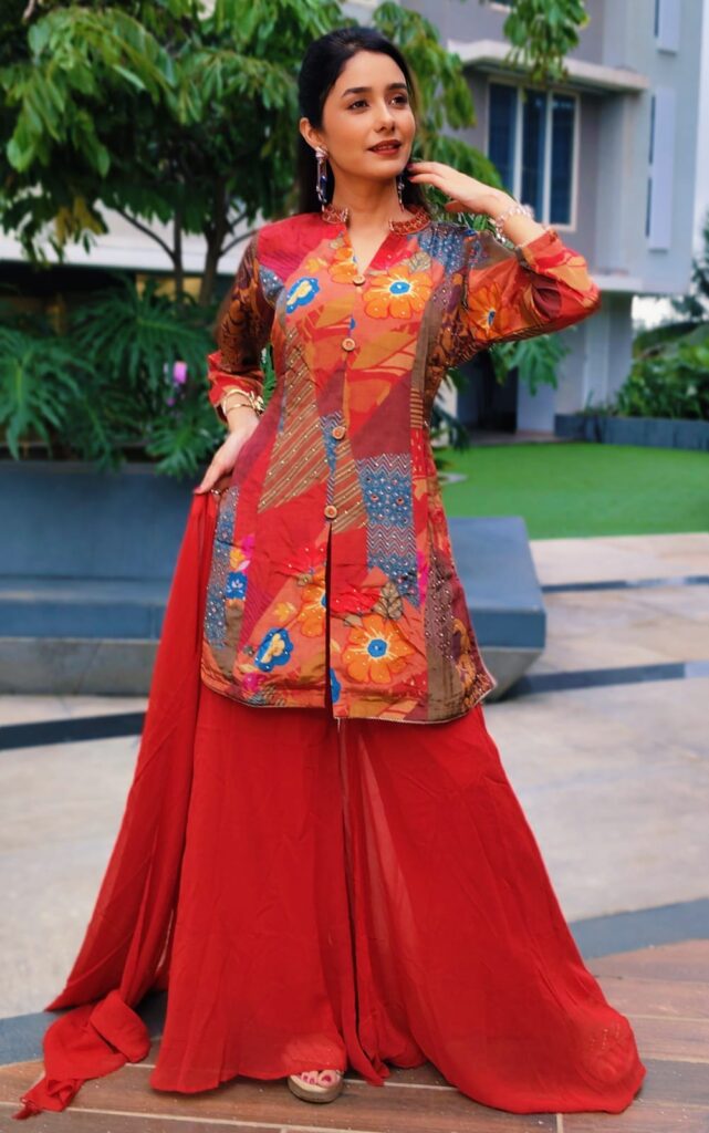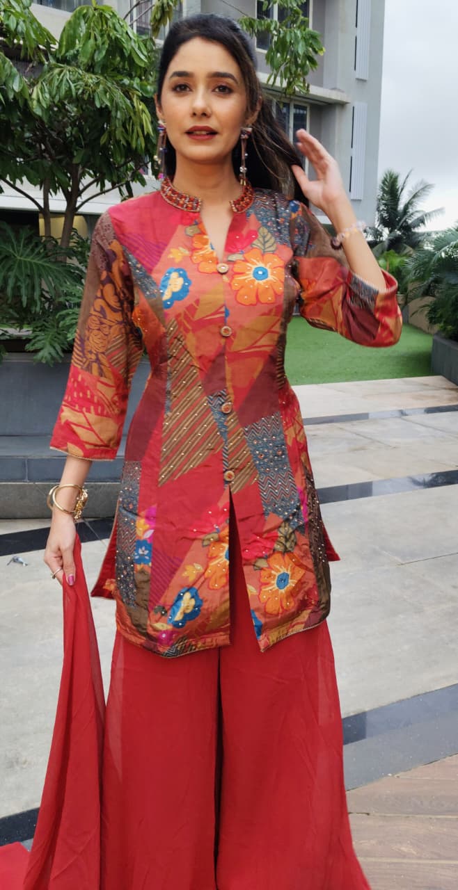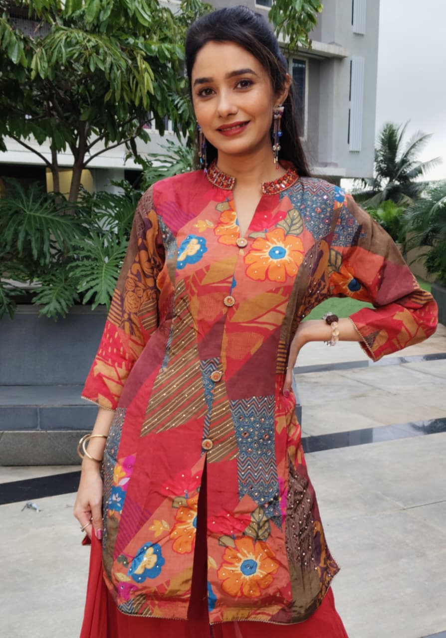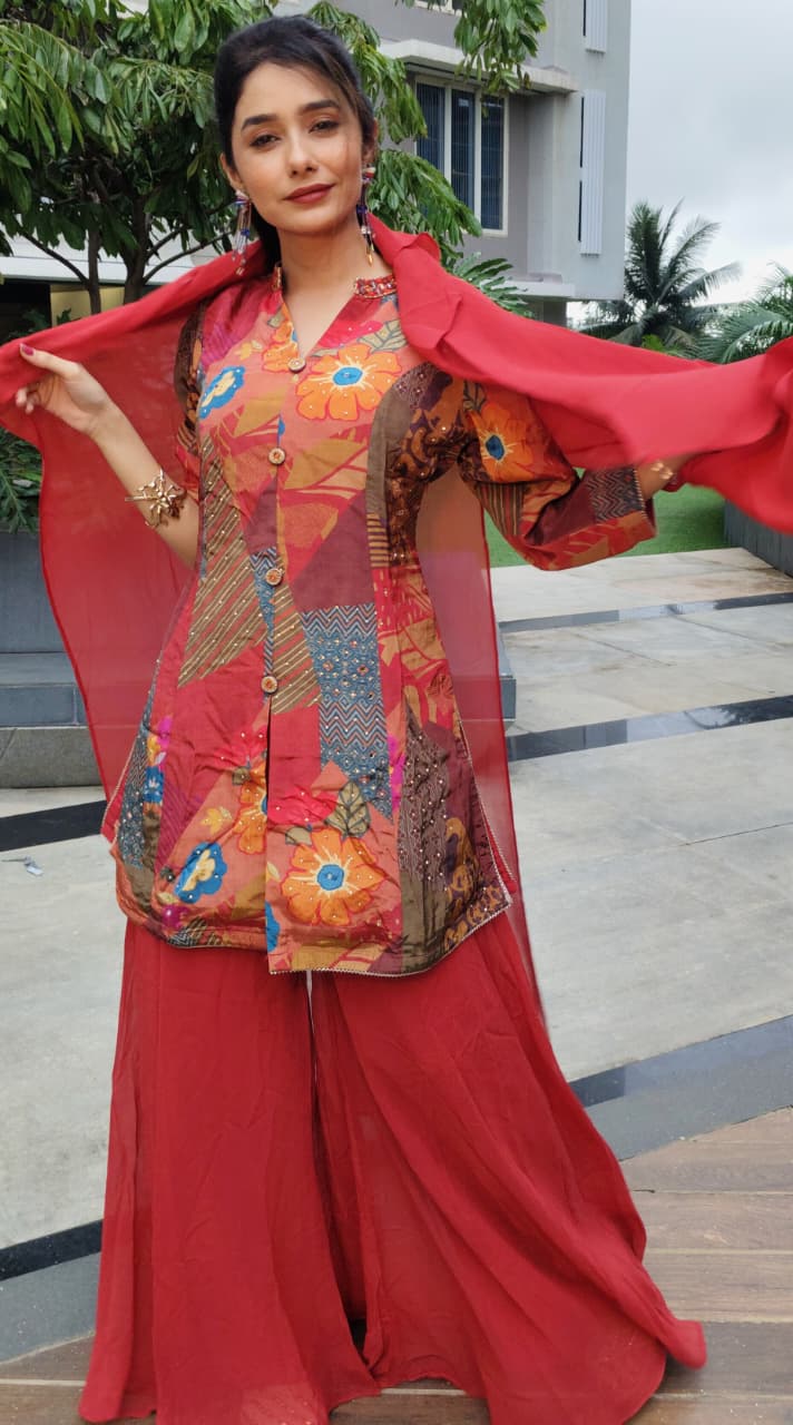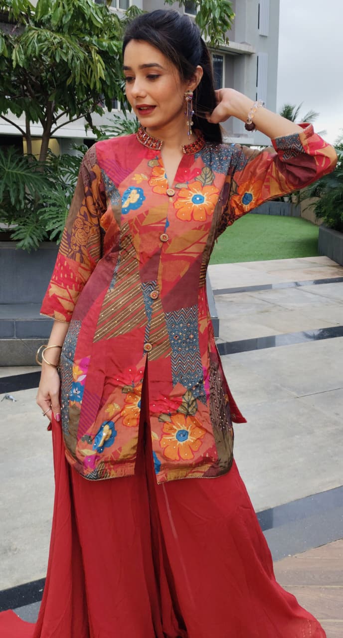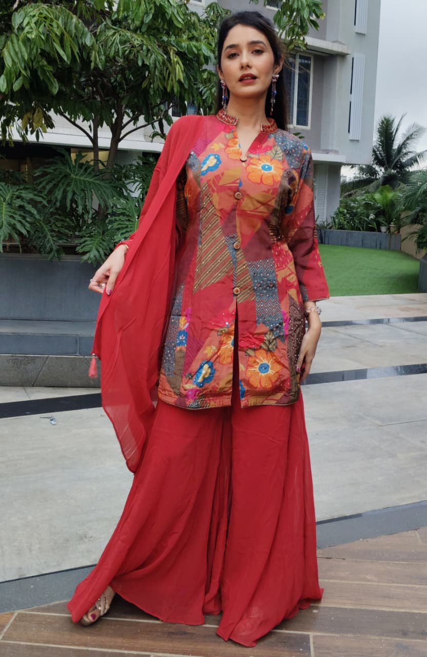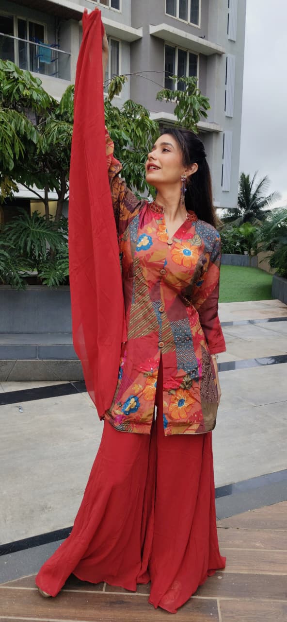 Turn heads with this stunning Vibrant Patchwork Red Sharara Set, a perfect blend of tradition and modern flair. Featuring a flowy sharara bottom, a colorful printed kurta with patchwork detailing, and a matching dupatta.